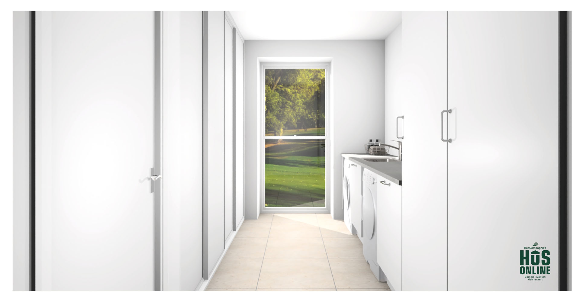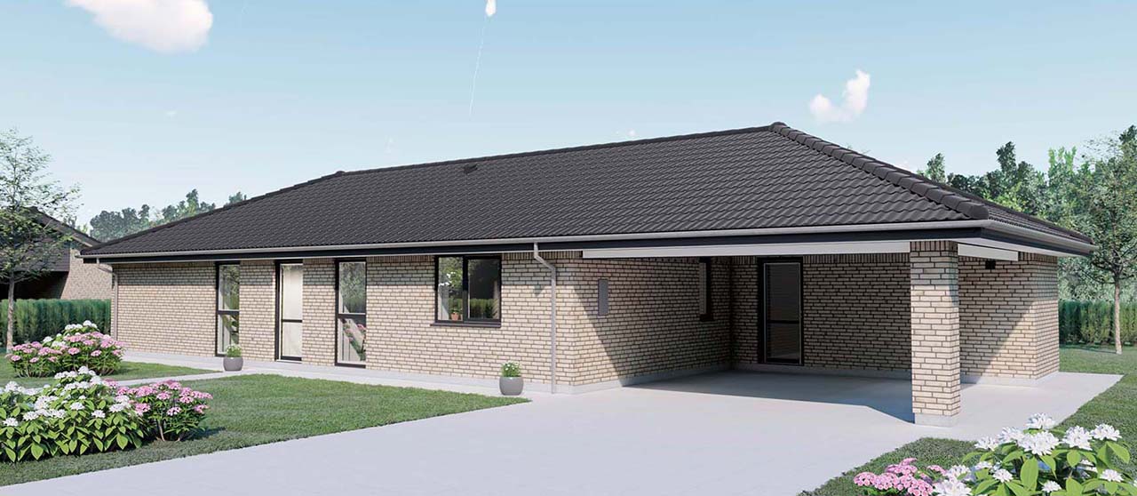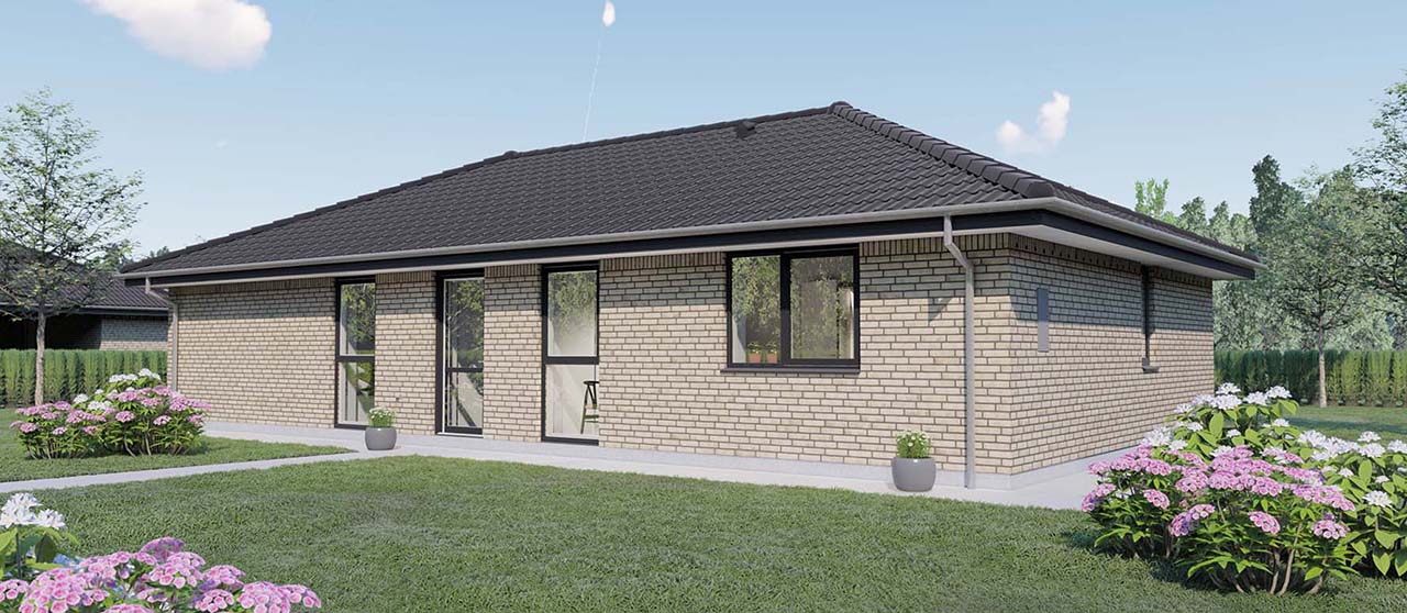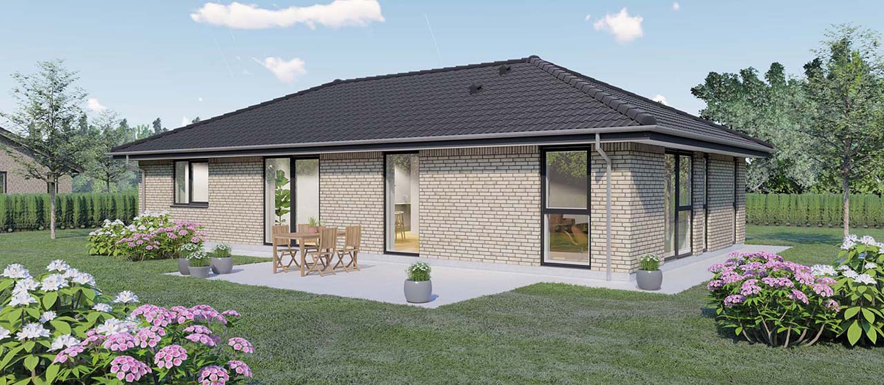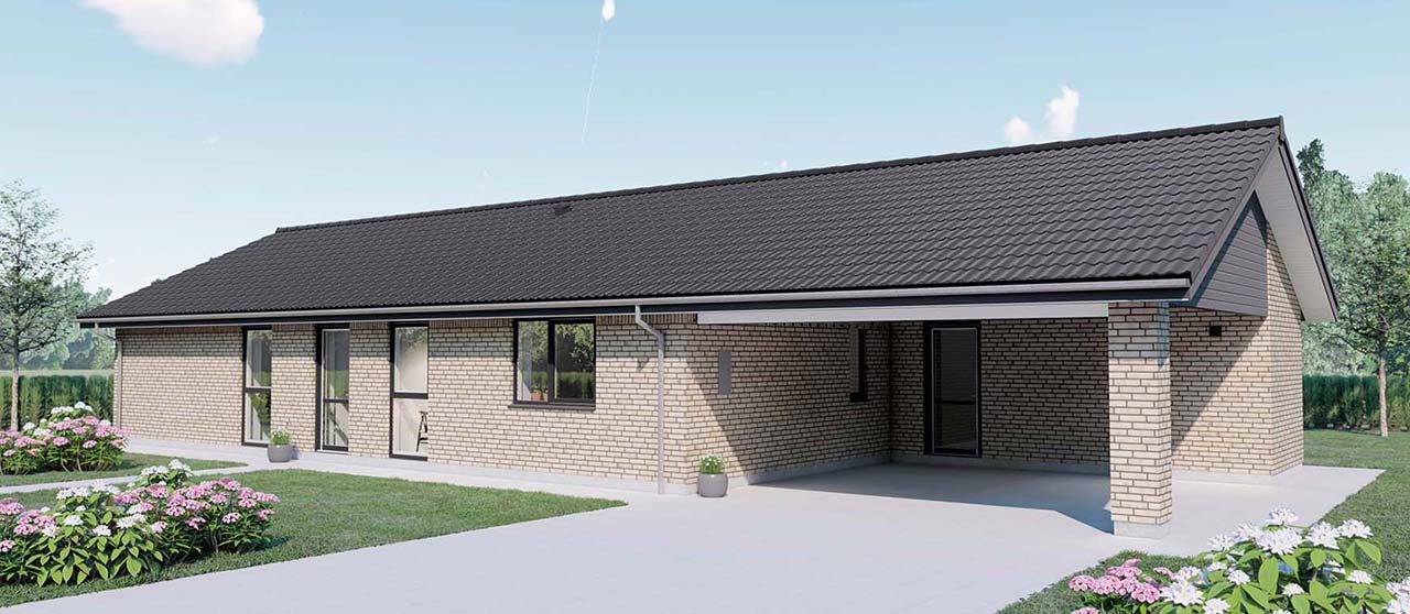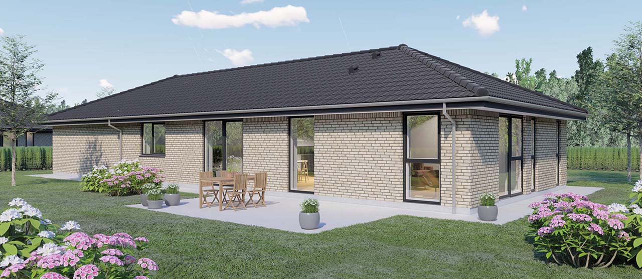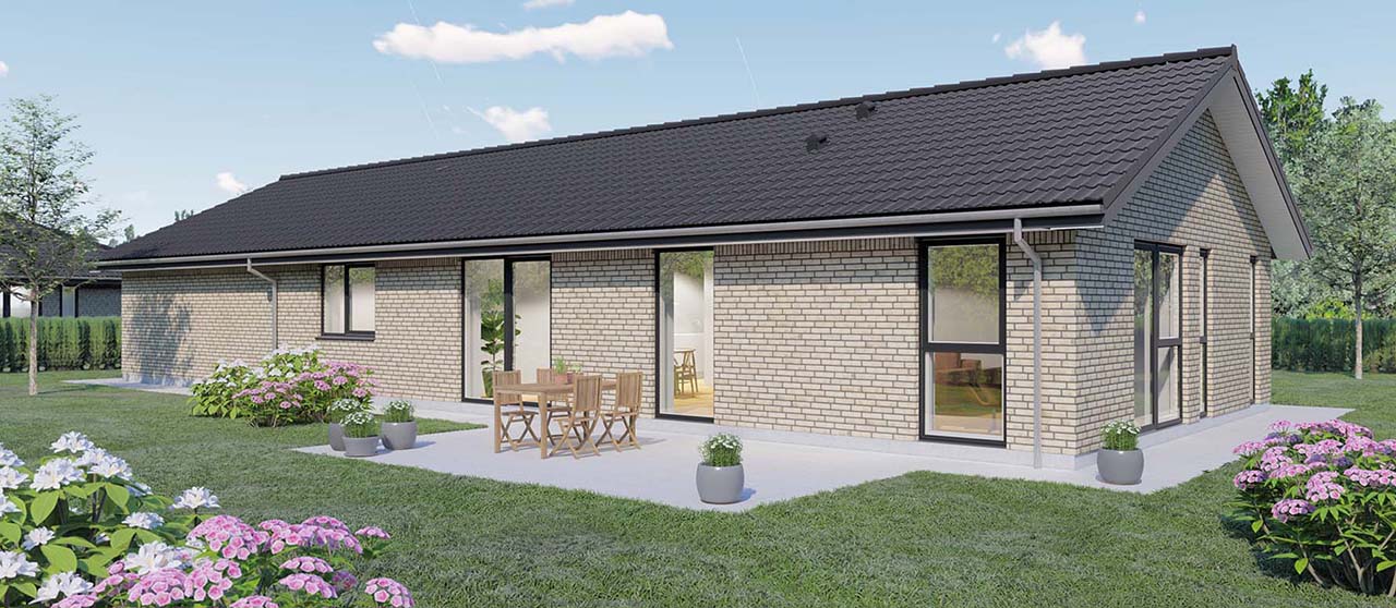 Plantegningen viser et yderst veludnyttet længehus på 120 kvm, velegnet både som familie- og seniorbolig. Indgangen leder til en rummelig entré med garderobeplads og et ekstra stort bryggers, der tilbyder masser af opbevaringsplads. De tre gode værelser inkluderer et soveværelse med en stor skabsvæg og to børneværelser. Det store køkken/alrum er hjertet i huset og imponerer med et skråloft og et stort vinduesparti, der giver masser af lys og luft samt direkte adgang til terrassen. Ligeledes er stuens endegavl udstyret med et stort vinduesparti, der åbner op til terrassen og haven.