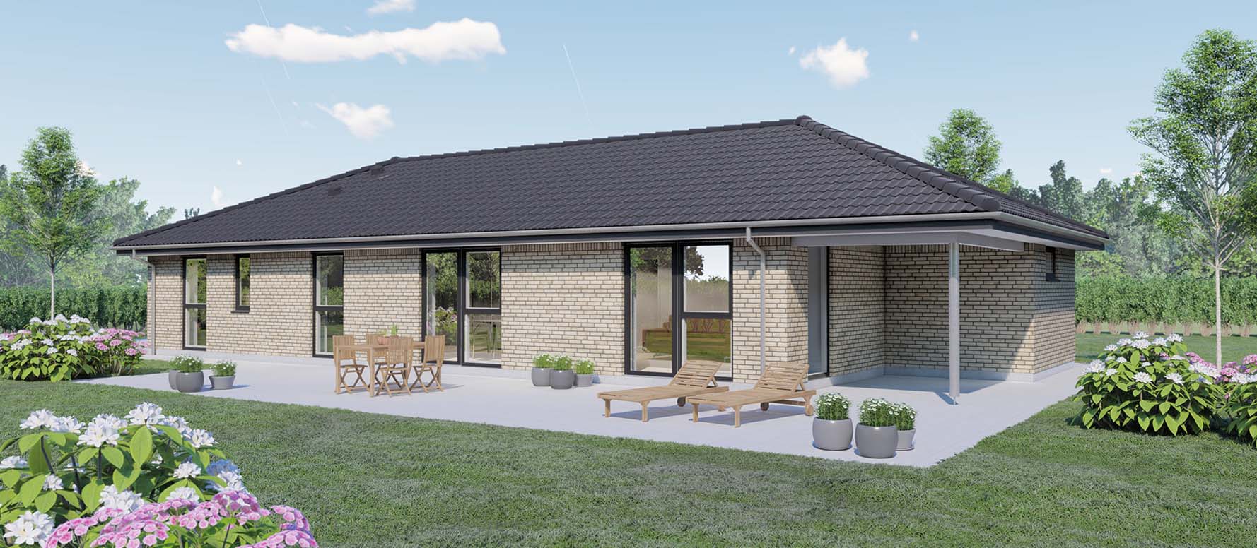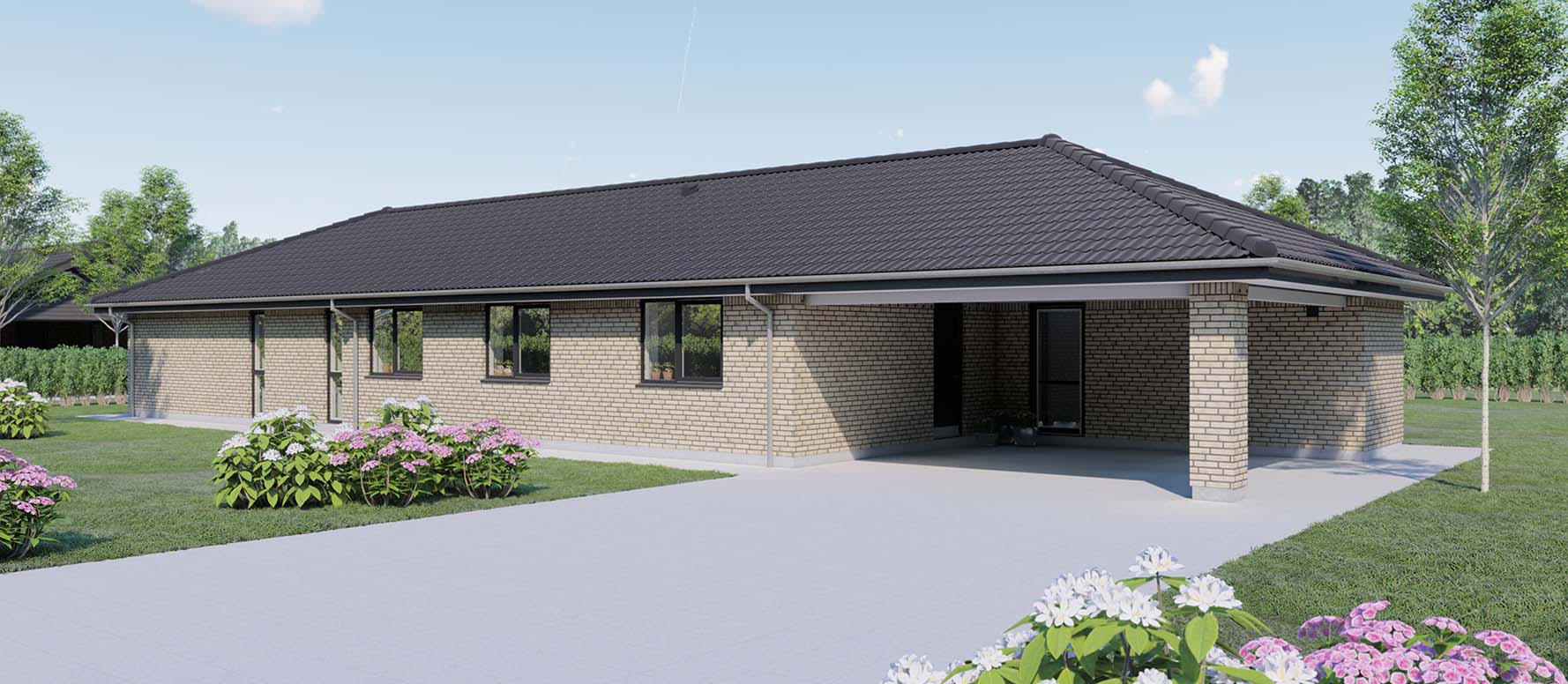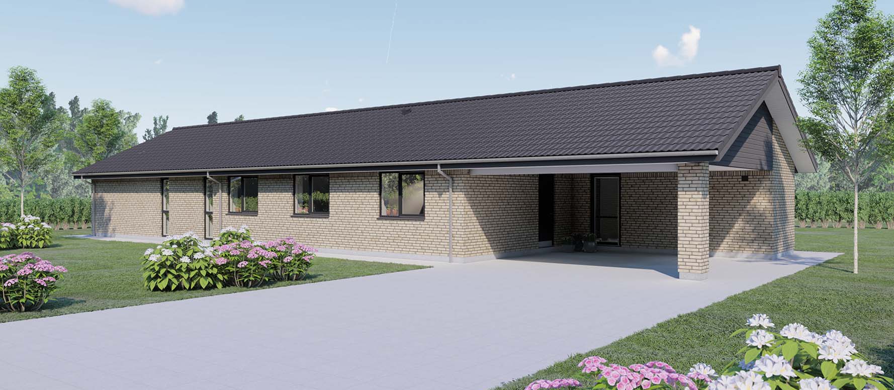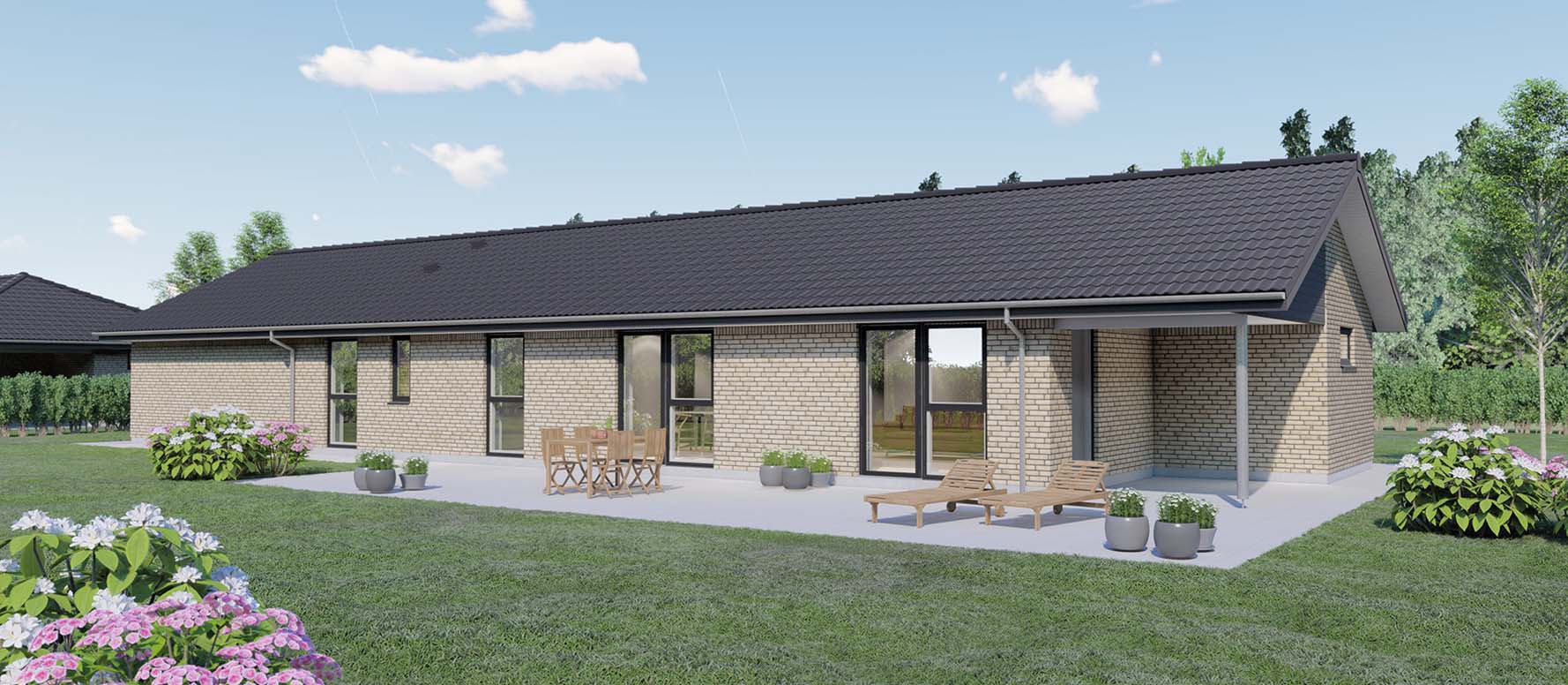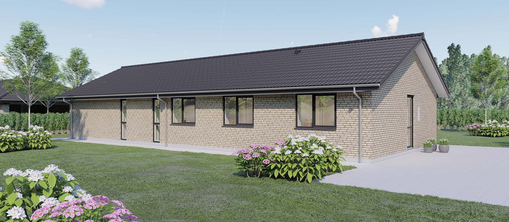 Dette længehus på 145 kvm byder på en åben planløsning, der skaber en fornemmelse af rummelighed og sammenhæng gennem hele huset. To gode børneværelser med tilhørende badeværelse er strategisk placeret i forbindelse med entréen, hvilket sikrer praktisk tilgængelighed og mulighed for privatliv for børnene. Der er også tænkt på opbevaringsbehovet med en indbygget garderobe og direkte adgang til bryggerset.